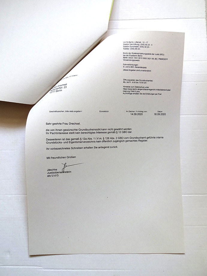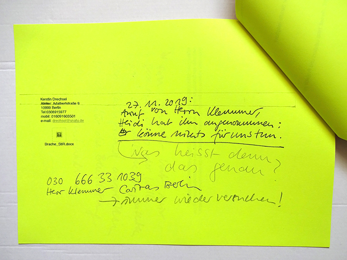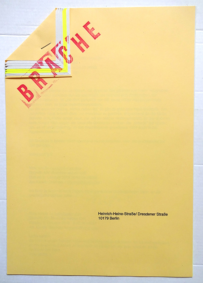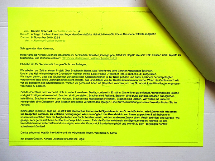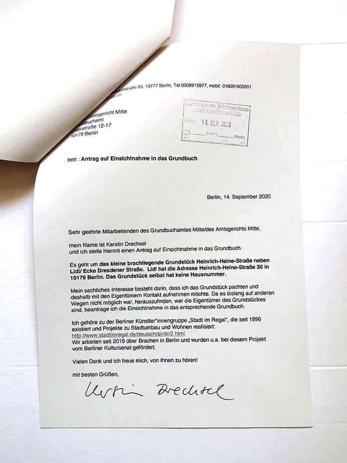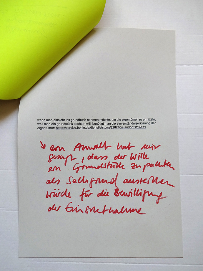 Sammlung von Dokumenten zur Recherche von Kauf oder Pacht einer Brache, um sie dem kapitalistischen Wirtschaftkreislauf zu entziehen, 8 Seiten mit Deckblatt, 29,7 x 21 cm.