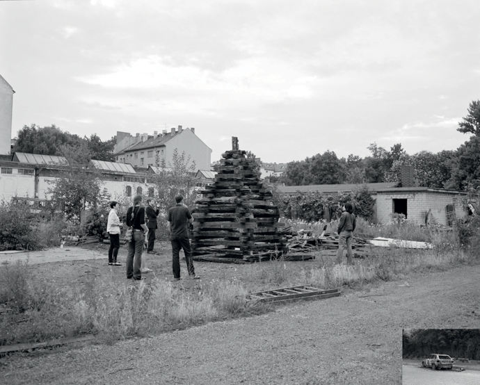 Holzbohlen lagen auf der freien Fläche herum. Ich habe Franziska Wicke gebeten, sie so mit mir aufzuschichten, wie ich es in der Schweiz bei den Augustfeuern gesehen hatte. Ich wollte auch ein Feuer machen und habe Freund:innen dazu eingeladen. Die Feuerwehr hat mir nicht erlaubt, das Holz anzuzünden, stattdessen hat ein Auto in der Rütlistraße gebrannt. (Otto – für Markus Rohrbach, Holzbalken, Rütli-Straße, verbranntes Auto, 1.8.2009; Fotografie (Stefanie Bischoff), Poster 64 cm x 50 cm, 2009)