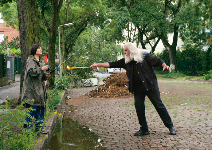 Roy C. Sullivan steht im Guinness Buch der Rekorde, weil er sieben Mal vom Blitz getroffen worden ist. 2009 habe ich entschieden, die Blitzeinschläge nachzustellen. Wolfgang Janzer, der aussieht wie ich mir Gott vorstelle und in der Kinder- und Jugendfreizeiteinrichtung Manege in der Rütlistraße arbeitete, schien mir eine ideale Besetzung für den Blitz zu sein. Ohnehin war die Rütlistraße wie gemacht für den letzten Einschlag, der bei einem Angelausflug passiert war: Weil die Straßenpflasterung sehr uneben war, haben sich, wenn es stark geregnet hat, riesige Pfützen gebildet. Nach einem solchen Schauer, haben wir die Situation nachgestellt: Ich habe als Roy C. Sullivan in einer der Pfützen geangelt und Wolfgang Janzer hat mit der Gartenfackel den Blitz gemacht. (Ein Jahr für Roy C. Sullivan, Blitz Nr. 7, 25.6.2009; Fotografie (Paul Pawlicki), Maße variabel, 2009)