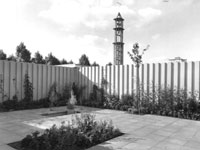 STADT IM REGAL sind im Hansaviertel die Atriumhäuser des Architekten Eduard Ludwig aufgefallen: Beim Blick durch die Bäume überrascht die brutale Abschirmung der eingeschossigen Gebäude durch ebenso hohe Metallzäune.