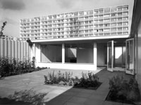 1953 beschließt der Berliner Senat den Wiederaufbau des Hansaviertels, eines durch den Krieg fast völlig zerstörten Viertels aus dem 19. Jahrhundert. Zur Internationalen Bauausstellung 1957 bekam eine Auswahl internationaler Architekten [sic] die Gelegenheit, die Ideen moderner Architektur und Städtebaus auf diesem begrenzten Areal in einer Art Modellversuch zu realisieren. So entstand inmitten dieses einmaligen Querschnitts durch den International Style auch der Ort der Ausstellung, die Akademie der Künste Berlin-West von Werner Düttmann.