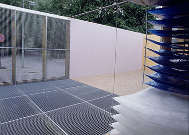 Die Installation „collapse kitchen“ ist ein ironischer Beitrag zur funktionalistischen Küche und deren unverrückbar platzierten Einbaumöbel. Der Raum wird durch gefaltete Objekte, die wie Volumenzeichnungen aussehen, eingenommen. Diese konstituieren selbst die Fassade - von außen sichtbar durch die neu eingebauten Stahlrostgitter der haushohen Garteneinfriedung.