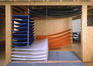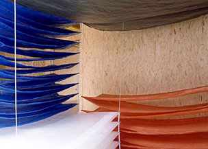 bungalow/ collapse kitchen, OSB-Platten, Kantholz, Schalungsträger, PVC - Folie (orange, blau, olivgrün, weiß), Stahlroste, -seile, -ösen, Zementfaserplatten (rubin E3), Bungalow: 21,50 m x 16 m x 3,20 m. collapse kitchen: 12,50 m x 9 m x 2,50 m