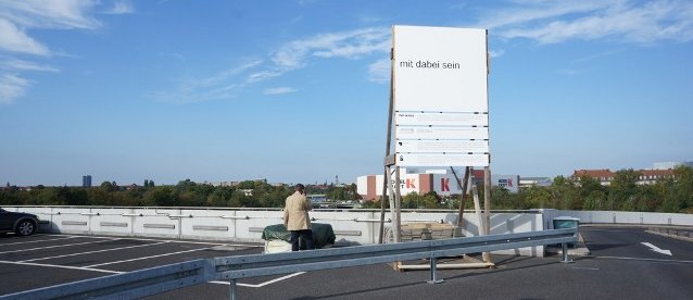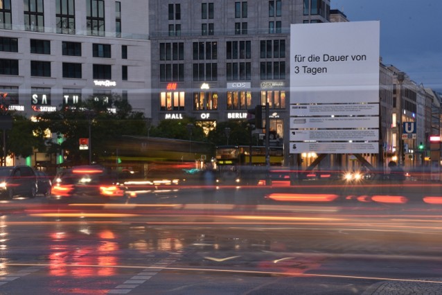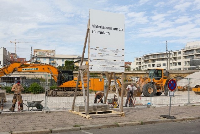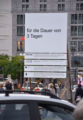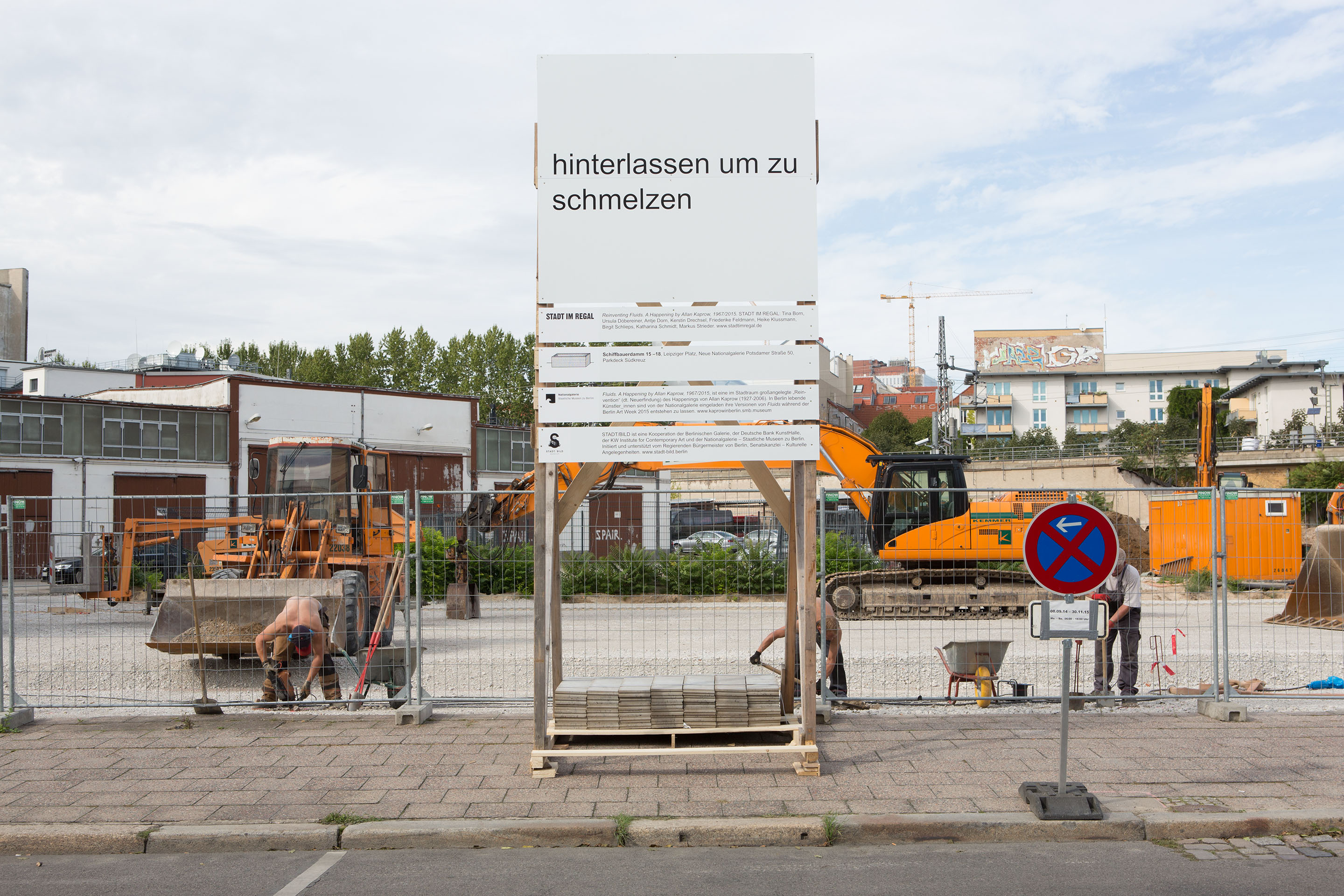 STADT IM REGAL stellt an vier Standorten im Stadtraum Berlins Bauschilder auf: Auf einer temporären Brache am Schiffbauerdamm, an der Potsdamer Straße vor der Neuen Nationalgalerie, auf dem Leipziger Platz und auf einem Parkdeck am Bahnhof Südkreuz. Parallel dazu werden Kühlschrankmagneten in Serie produziert, die zum Selbstkostenpreis in der Nationalgalerie im Hamburger Bahnhof erhältlich sind. Auf diesen Bauschildern und Kühlschrankmagneten sind Worte/Wortkombinationen des Kaprow-Plakates zu FLUIDS zu lesen. Aus dem beschreibenden Zusammenhang befreit, bilden die einzelnen Begriffe eine Partitur für den jeweiligen Ort im öffentlichen oder privaten Raum.
