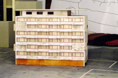 Das scheinbar schon etwas in die Jahre gekommene Architekturmodell eines modernistischen Wohnblocks birgt hinter der Fassade einen Zeichenschrank. Das Objekt ist somit gleichzeitig Verweis und funktionales Möbel. Die Fenster der deutlich "aufgehängten" Fassade geben den Blick auf die Rückwand des kahlen Schrankes frei.