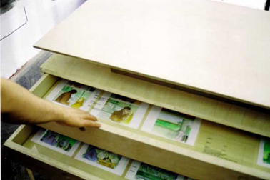 Die Zeichnungen in den Schubladen, zeigen Abläufe von unterschiedlichen Personen in alltäglichen städtischen Situationen bei alltäglichen Handlungen. Die Dialoge, die den Zeichnungen in Form einer über ihnen liegenden Folie zugeordnet sind, haben die Struktur einer neuen städtischen Ordnung zum Inhalt. Die Personen scheinen zukünftige Bewohner*innen des modernistischen Wohnblocks zu sein. Von Schublade zu Schublade wechseln Personen und Umgebung, die "Erzählung" der Dialoge knüpft jedoch an die vorherige Szenerie an.