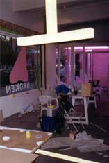 Yellowesk II, Sperrholzbau bezogen mit reflektierender Straßenmarkierung, 200 cm x 20 cm x 150 cm