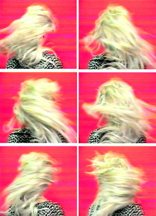 Transportkiste mit integriertem Lautsprecher und Videomonitor auf dem die Rückansicht einer Frau zu sehen ist, die zu einem Stück von Andreas Dorau ihren Kopf in Zeitlupe schüttelt.
